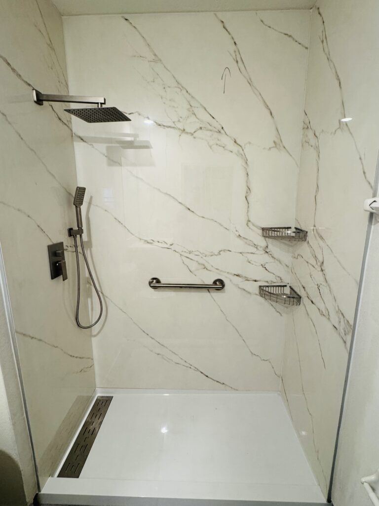 Next Level Shower & Bath installs large format porcelain tile with precision techniques that reduce grout joints and enhance surface durability. We laser-measure every project, custom-cut each panel, and install using expert methods to ensure long-term performance and visual consistency.